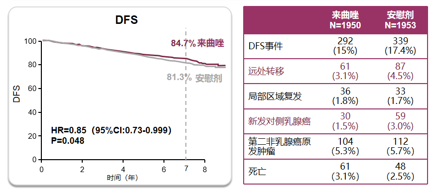 另外一项AI延长治疗的经典研究是NSABP B-42,主体分析已于2018年发表在《柳叶刀肿瘤学》(Lancet Oncol.),来曲唑延长5年的患者较不延长患者的7年DFS率绝对获益为3.4%,HR为0.85,P值为0.048。因为这项研究历经了多次中期分析,耗竭了α值,统计学显著水平设定为0.0418,0.048大于0.0418,因此结果的差异未能达到统计学意义。