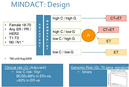 MINDACT研究入组6693名早期乳腺癌患者,以70基因检测确定基因风险;以Adjuvant! Online v8.0临床病理系统来确定临床风险: