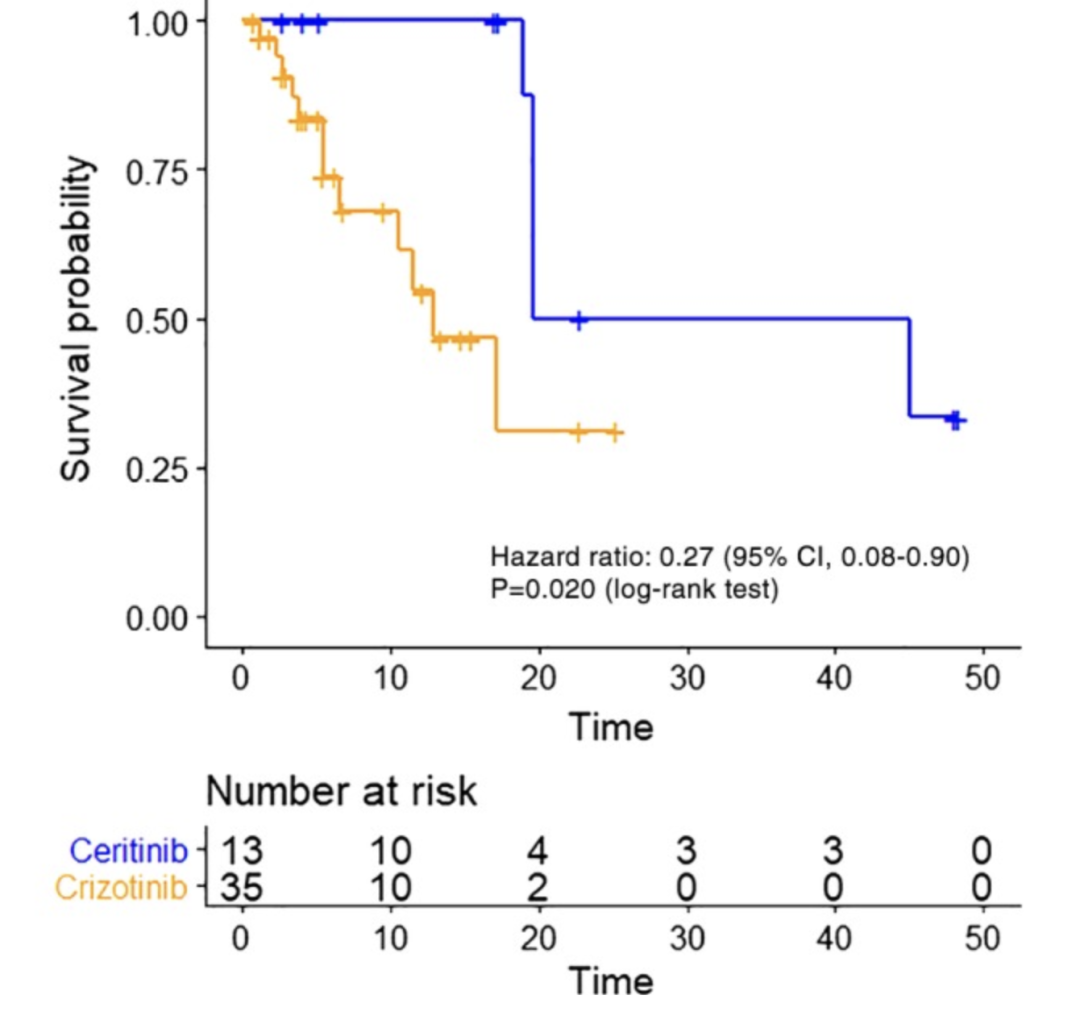 台湾长庚研究数据库回顾性研究了48例接受ALK抑制剂一线治疗患者的疗效,其中35例患者接受克唑替尼治疗,13例患者接受塞瑞替尼治疗。结果显示塞瑞替尼治疗患者的PFS获益明显优于克唑替尼患者(32.3 vs.12.9个月,P = 0.020),塞瑞替尼治疗患者的ORR也显著优于克唑替尼组,且不良反应方面塞瑞替尼更轻,尤其是肝功能异常方面。