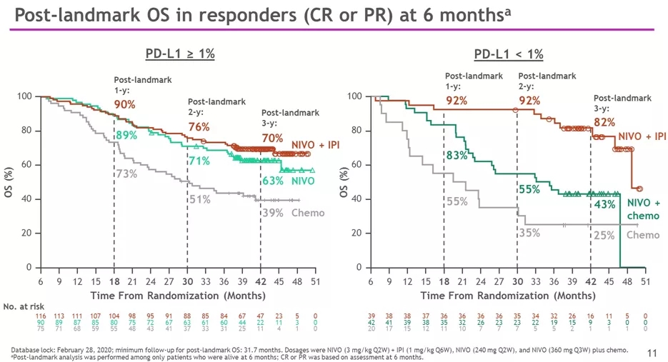 CR/PR患者长期生存可期:研究还发现6个月时获得CR/PR的患者,双免疫治疗3年OS率远高于化疗组,分别为70% vs. 39%(PD-L1≥1%)和82% vs. 25%(PD-L1<1%),双免疫方案使驱动基因阴性晚期NSCLC患者的3年OS率达到70%~82%,这说明患者若对双免疫方案产生治疗响应,可获得深度且持久获益,这部分患者有望获得长期生存。