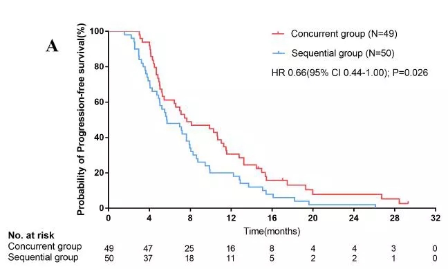 数据显示,同步化疗组和续贯化疗组的PFS分别为7.7个月和5.7个月(HR=0.66, 95% CI: 0.44–1.00),差异有统计学意义(P=0.026)(图2)。