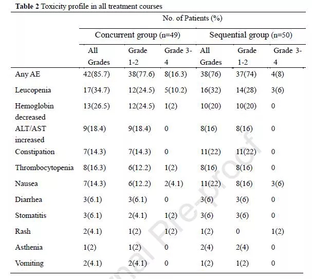 安全性:80.8%的患者出现1~4级不良反应,没有患者出现5级不良反应,没有患者因不良反应导致治疗中止,两组之间所有级别不良反应发生率分别为85.7%和76.0%,差异无统计学意义(P=0.22),3~4级不良反应发生率分别为16.3%和8%,差异同样无统计学意义(P=0.336)。在同步治疗组,最常见的不良反应包括白细胞下降、贫血、肝酶升高;在续贯治疗组,最常见的不良反应包括白细胞下降、便秘和恶心。两组最常见的3~4级治疗相关不良反应均为白细胞下降(图6)。