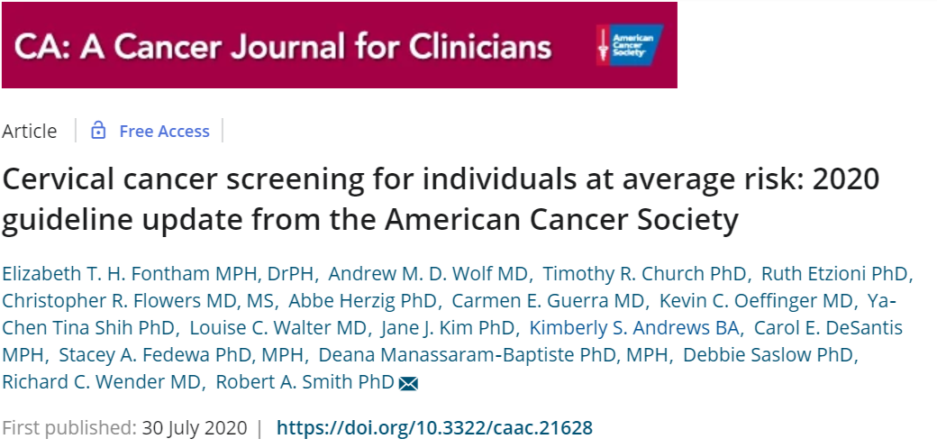 1.Fontham ETH, Wolf AMD, Church TR, et al. Cervical cancer screening for individuals at average risk: 2020 guideline update from the American Cancer Society [published online ahead of print, 2020 Jul 30]. CA Cancer J Clin. 2020;10.3322/caac.21628. doi:10.3322/caac.21628