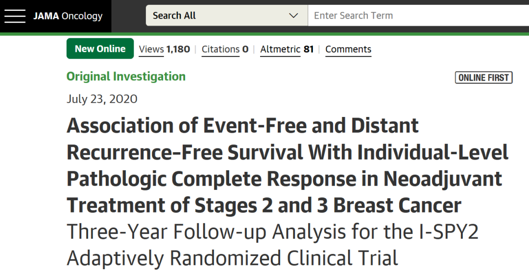 I-SPY2 Trial Consortium, Yee D, DeMichele AM, et al. Association of Event-Free and Distant Recurrence-Free Survival With Individual-Level Pathologic Complete Response in Neoadjuvant Treatment of Stages 2 and 3 Breast Cancer: Three-Year Follow-up Analysis for the I-SPY2 Adaptively Randomized Clinical Trial [published online ahead of print, 2020 Jul 23]. JAMA Oncol. 2020;e202535. doi:10.1001/jamaoncol.2020.2535