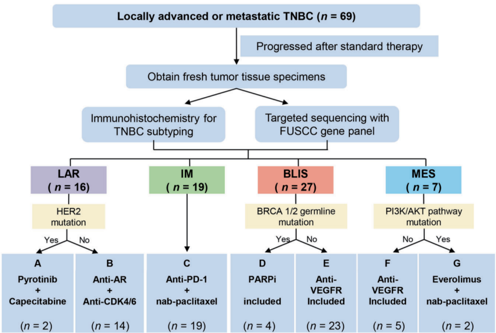 基于精准的“复旦分型”方案,我们了设置FUTURE临床试验,该研究为“伞形”研究,主要针于对经过多轮治疗后(入组患者既往中位治疗线数为3)仍然出现进展的三阴性乳腺癌,并根据“复旦分型”分为7个治疗臂,分别接受不同的方案治疗(见图1)。今年7月份,FUTURE临床试验结果在Cell Research发表。