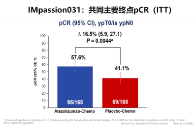 Impassion031是阿替利珠单抗联合化疗新辅助治疗早期三阴性乳腺癌的III期研究。在ITT人群中,阿替利珠单抗+化疗与安慰剂+化疗相比,pCR率提高了16.5% (57.6% vs 41.1%,P=0.0044) 。虽然EFS、DFS和OS数据尚未成熟,但其趋势支持阿替利珠单抗+化疗的pCR获益。是继KEYNOTE-522之后,再次证实免疫治疗在TNBC新辅助治疗的地位。