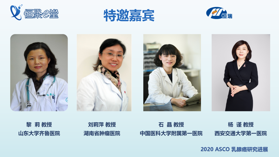 青山同路,与乳同行。2020年10月15日,来自全国各地专家再次齐聚“恒聚e堂”,共同参加由中国医学科学院肿瘤医院徐兵河教授担任大会主席的“2020ESMO乳腺癌治疗进展解读”专场,本期会议邀请了三位吡咯替尼研究的主要研究者河南省肿瘤医院刘真真教授,闫敏教授及四川大学华西医院罗婷教授讲述与解读卓越数据背后的故事,同时也邀请了中国医学科学院肿瘤医院王佳玉教授带我们一览2020年ESMO乳腺癌最新进展。会上齐聚各方观点,来自西安交通大学第一医院杨谨教授、山东大学齐鲁医院黎莉教授、中国医学大学附属第一医院石晶教授和湖南省肿瘤医院刘莉萍教授就会议相关的热点问题进行了深入的探讨,同时也带来了更多的思考。