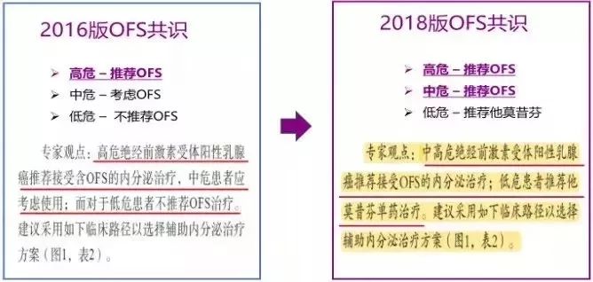 《中国早期乳腺癌卵巢功能抑制临床应用专家共识(2016版)》中,推荐高复发风险的绝经前激素受体阳性乳腺癌患者接受含 OFS 的内分泌治疗,中危患者应考虑使用,低危患者不推荐使用。2018版OFS共识与2016版相比,将OFS的获益人群由高危和部分中危更新为中危和高危,强调了中危患者OFS治疗的获益。