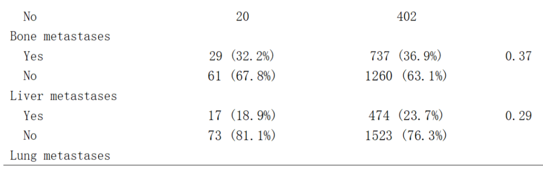 根据初诊晚期乳腺癌时是否伴有脑转移,将患者分成两组,并进行基线特征的比较。发现脑转移的发生率在整体人群中约为4.3%(共90例脑转移患者),其中HER2阳性型发生率最高,为7.2%,其次为三阴性乳腺癌(5.2%),最后是HR+HER2-型(2.5%)。