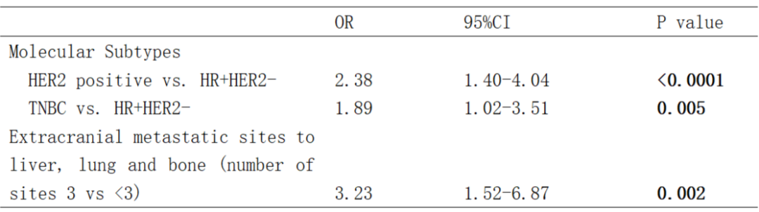 通过多因素logistic回归分析,发现HER2阳性、三阴性乳腺癌以及广泛的颅外转移(同时转移至肝、肺、骨三个部位)提示初诊晚期乳腺癌时更容易伴有脑转移。