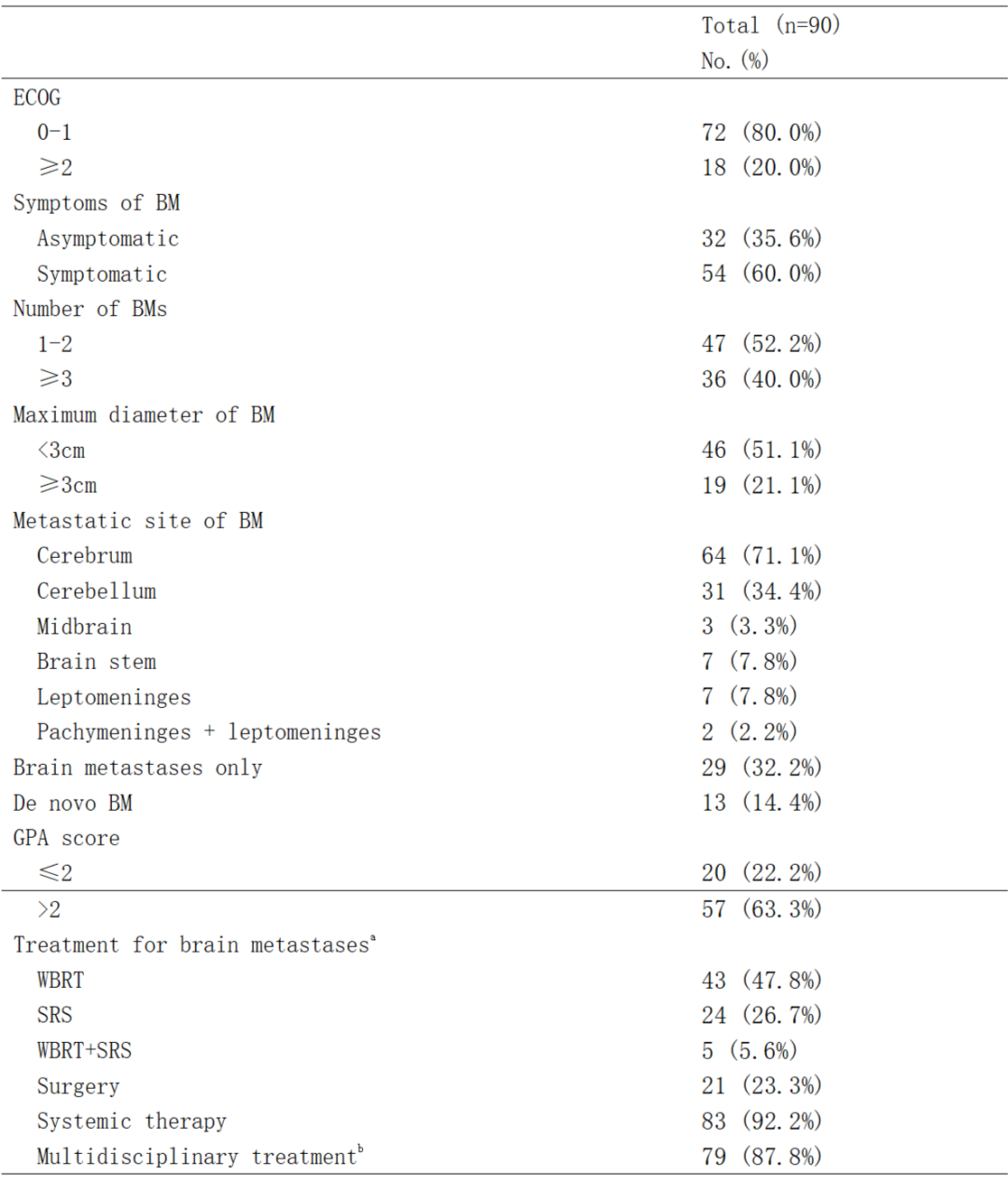 表3总结了90例初诊晚期乳腺癌即伴有脑转移患者的肿瘤特征及治疗情况。其中90%以上的患者均接受了全身治疗或局部治疗。