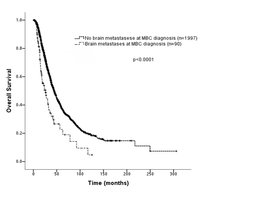图1.初诊晚期乳腺癌伴或不伴脑转移患者的总生存