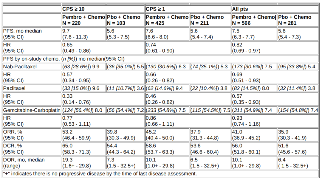 截至2019年12月11日,pembrolizumab+化疗和安慰剂+化疗的中位随访时间分别为25.9个月(n=566)和26.3个月(n=281)。无论何种化疗方案和CPS的界值,PFS的HR都倾向于pembrolizumab治疗组(见下表)。在ORR、DCR和DOR的关键次要终点,pembrolizumab +化疗的疗效也较好,且疗效随着CPS的增加而增加(见下表)。