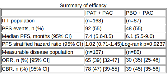 在这项关键的III期临床试验的队列A(NCT03337724)中,符合条件的患者患有PIK3CA和/或AKT1和/或PTEN改变的可测量aTNBC,ECOG表现为0/1,是紫杉烷单药治疗的合适候选人,并且尚未接受过aTNBC的化疗。患者按2:1的比例随机接受口服IPAT 400 mg或PBO(1-21天),均与IV PAC 80 mg /m2(第1、8和15天)联合使用。每28天重复周期,直到疾病进展,不可接受的毒性或患者退出治疗为止。并按照先前是否接受过(新)辅助化疗、地理区域(亚太地区,欧洲,北美,世界其他地区)和肿瘤改变状态(PIK3CA/AKT1激活突变与没有PIK3CA/AKT1激活突变的PTEN改变)进行分层。主要终点是研究者评估的PFS。次要终点包括总体生存期(OS;关键次要终点),客观缓解率(ORR),缓解持续时间,临床获益率(CBR),患者报告的结局和安全性。