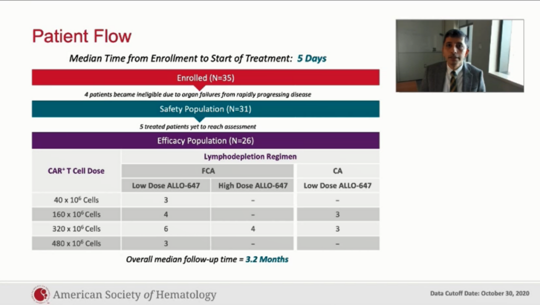 截至2020年7月8日,共纳入19名病人,其中15名接受3种药物剂量水平(DL)的ALLO-715:3名患者接受DL1(3 FCA and 0 CA); 7个患者接受DL2 (4 FCA and 3 CA); 5个患者接受DL3 (3 FCA and 2 CA)。截止观察时没有患者接受FCA+方案或 ALLO-715 DL4剂量。患者在入组时都处于疾病的进展阶段(既往治疗线数为5(范围:3-11))且31.6%的患者在国际分期系统(ISS)中处于III期,入组前均进行预处理。其中有1例患者既往接受过自体干细胞移植治疗。