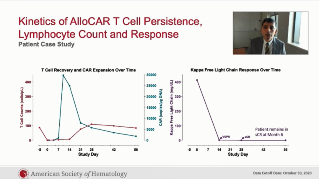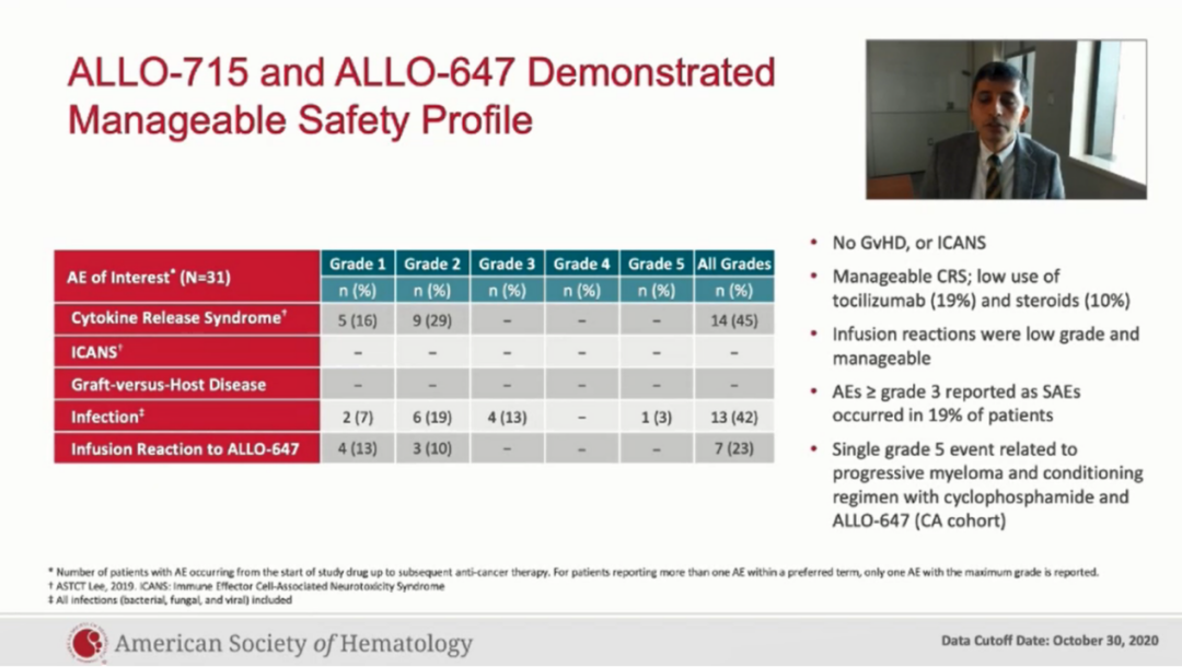 在安全性方面:①最常见的3级及以上的不良反事件为贫血(42.1%),中心粒细胞减少(41.2%),淋巴细胞减少(29.4%)以及血小板减少(29.4%)。4例病人发生3级及以上的感染,其中3例是3级,包括细小病毒B19,葡萄球菌以及肺炎,目前已治疗好转。第4例是5级,发生在一个急性进展的难治性骨髓瘤患者ALLO-715输注后的第8天,第1天表现为非中性粒细胞减少的发热和多灶性肺炎,血培养、痰培养均阴性,该患者最终进展为呼吸衰竭而死亡。我们考虑这例死亡病例与预处理相关。