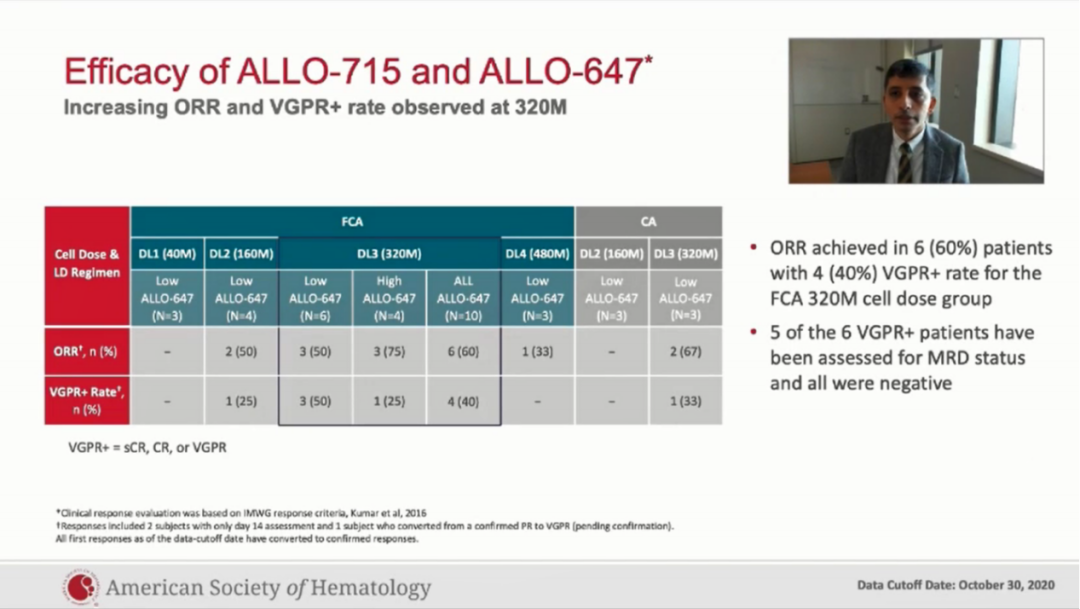 这些早期数据提示ALLO-715和ALLO-647有着可控的安全性。ALLO-715在复发难治性多发性骨髓瘤患者(R/RMM)的同种异体治疗表现出一定的临床有效性,并且临床效果与细胞剂量呈正相关。