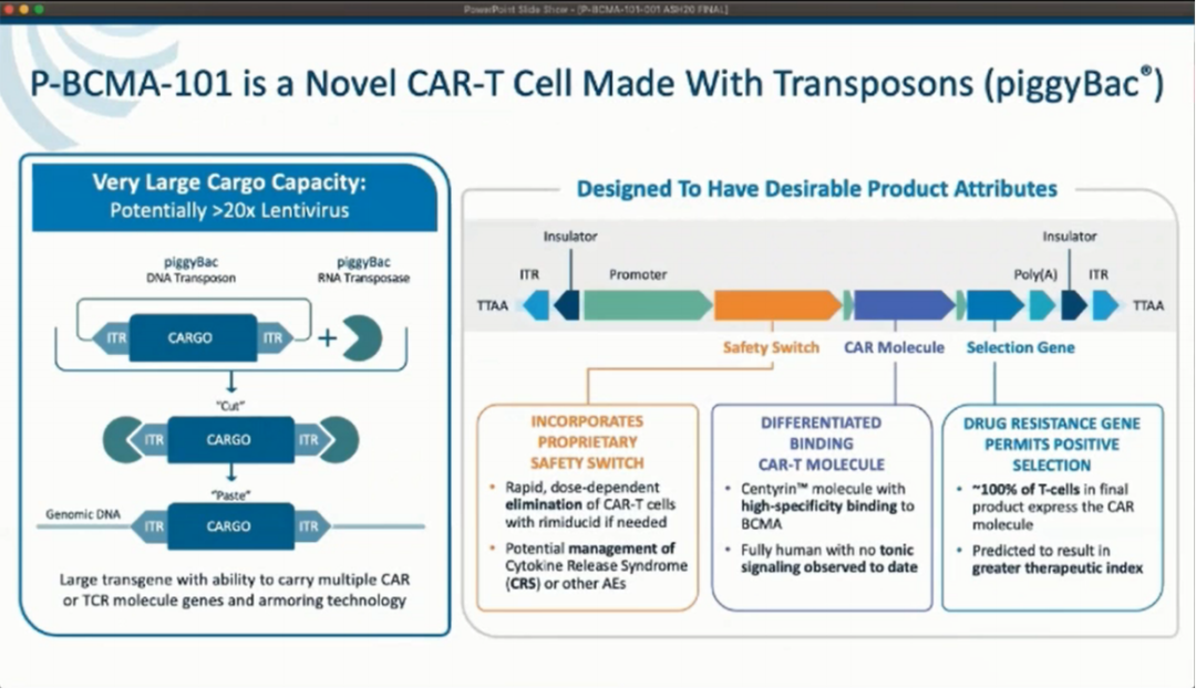 P-BCMA-101是一种以BCMA为靶点的自体嵌合抗原受体T细胞(CAR-T),由高比例的高品质干性记忆性T细胞组成。P-BCMA-101是使用一种新的基于转座子的系统piggyBac(编者注:在我们研究某种疾病的发病机制或者某种药物的作用靶点时,经常需要建立目的基因过表达或基因敲除的细胞模型,目前构建稳转细胞株及部分敲除细胞株最常用的方式之一是慢病毒法,慢病毒因其可以转染几乎所有种类的细胞,且在转染后可以整合到细胞的基因组而长期表达的优势,是目前较为主流的构建方法,但慢病毒构建的稳转细胞株相对于野生型没有生长优势;此外,慢病毒对目的基因的载量也有限。因此,寻找一种高效简便可替代慢病毒法的方法显得尤为重要。转座子的出现为构建基因编辑细胞株提供了一个全新的视野。转座子也被称为跳跃基因,由Barbara McClintock教授在上世纪50年代发现,并于1983年因此发现而获得诺贝尔医学奖,是指一段DNA序列由基因组的一个位置跳跃到另一个位置。)制造的,旨在提高疗效的同时将毒性降至最低。研究中改进可生产工艺和给药方案的确带来了更好的安全性和更高的疗效。P-BCMA-101显著提高了疗效和安全性上,更加便利了MM的治疗,且便于门诊输注,在未来的临床应用上前景广阔。