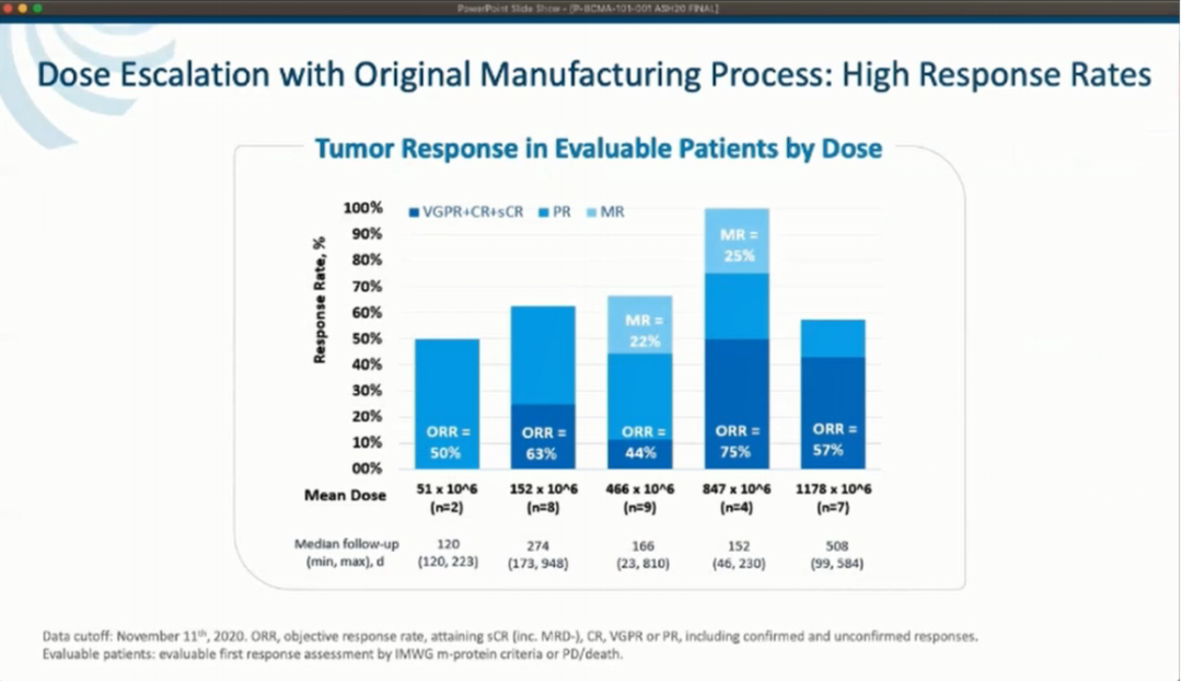 有效率方面:①34名患者在初始剂量增加期间单次给药的总有效率(ORR)为57%。我们没有观察到明确的剂量反应曲线,但发现在较低剂量下有更好的反应,因此我们使用改进的生产工艺对额外的队列进行研究,重点关注采用目前剂量范围的最低剂量的效果。