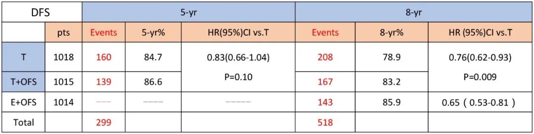 同时,SOFT研究8年结果,是预先计划的分析,在未达计划事件数(实际518事件数 vs 计划738事件数,表-1)的情况下,证实OFS+TAM vs. TAM显著提高了整体人群的DFS。