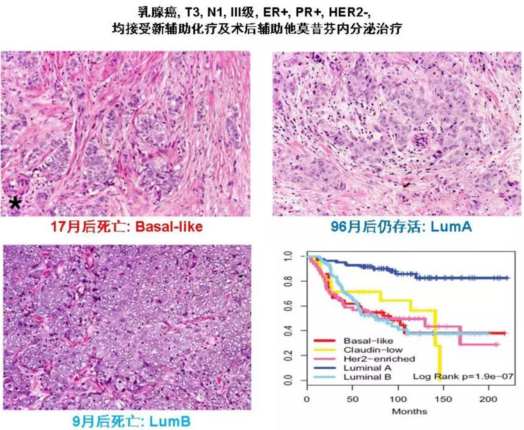 以下是一组来自国外的研究,从临床分期来讲,均属于T3N1,ER+,HER2-乳腺癌患者,三名患者均接收新辅助化疗及术后辅助他莫昔芬内分泌治疗,但存活时间却迥然不同,那要如何解释这种现象呢??