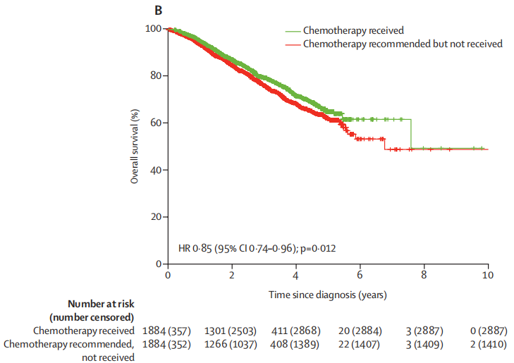 对倾向匹配样本进行了额外的亚组分析,对记录在案Charlson合并症评分大于0的患者进行了分析,结果表明,与推荐化疗但未接受化疗的患者相比,化疗的获益仍然持续存在(HR 0.74[95%CI:0.59~0.94];P=0.013)。