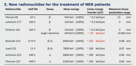 177Lu作为PRRT最常用的治疗核素,利用衰变产生的ß射线来杀伤肿瘤细胞,90Y也是释放ß射线,因其射程较长而经常单独或与177Lu序贯应用。而比ß核素能量更高,杀伤力更强的是α核素,如225Ac、213Bi等,目前也有小样本的临床研究来探索α核素PRRT的应用,以期待更高的ORR。