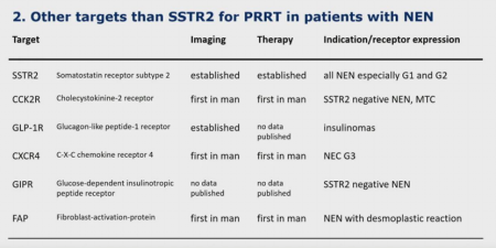 PRRT的发展,除了让自身变得更强更有效,另一方面,就是弥补自己的盲区和弱点,PRRT的盲区就是SSTR表达阴性以及分化较差的NEC。近几年,新型示踪剂的出现,或特异性(如CCK2R、CXCR4),或广谱(FAPI),其远大的理想绝不仅仅是显像,而是诊疗一体化,进行靶向核素治疗,Damian教授所提到的新靶点如下图所示。