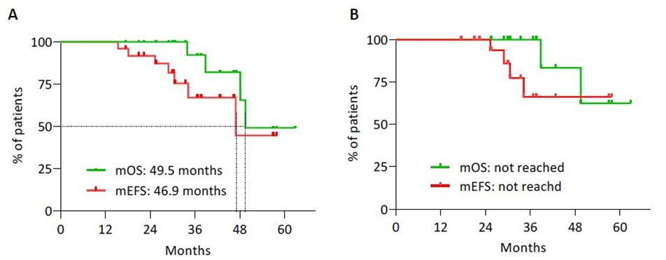 图2:(A)总体人群和(B)接受根治性手术患者的EFS和OS的Kaplan-Meier曲线