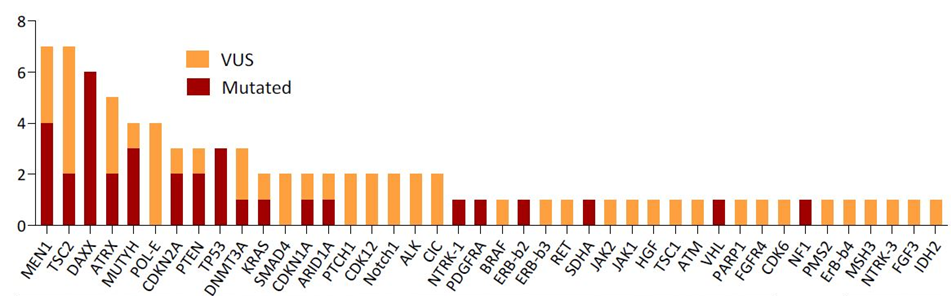 18例患者结果分析显示最常见的突变基因为DAXX、MEN1、TP53、MUTYH、ATRX、CDKN2A、PTEN和TSC2;