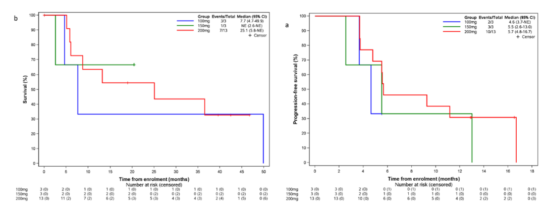 结果:22名患者(100 mg 4例, 150 mg 3例, 200 mg 15例) 中,只有一名vorolanib 200 mg队列中的患者出现剂量限制性毒性(4级血小板减少症),并且尚未达到最大耐受剂量(MTD)。最常见的与治疗相关的不良事件为蛋白尿(100%)、白细胞减少症(77%)、高胆固醇血症(77%)、高低密度脂蛋白血症(68%)、高甘油三酯血症(64%)、高血糖(59%)和疲劳(55%)。大多数为1-2级不良反应、3级以上不良反应多见于200mg队列。Vorolanib表现为Cmax和AUC随剂量递增呈比例增加,并且终末半衰期短(4.74±1.44 至12.89±7.49 h)。各队列患者的依维莫司药代动力学参数相似。19例可评估患者中,ORR和DCR分别为32%(n=6, 95%CI:13~57%)和100%(95%CI, 82~100%)。