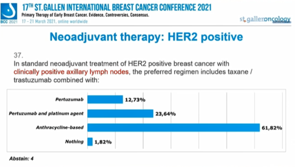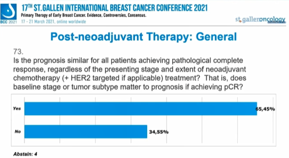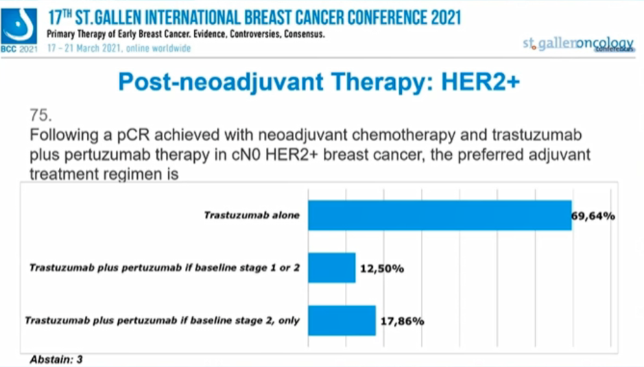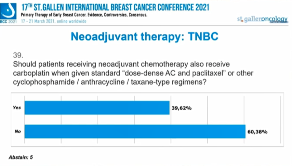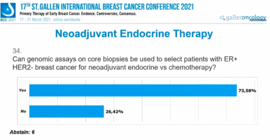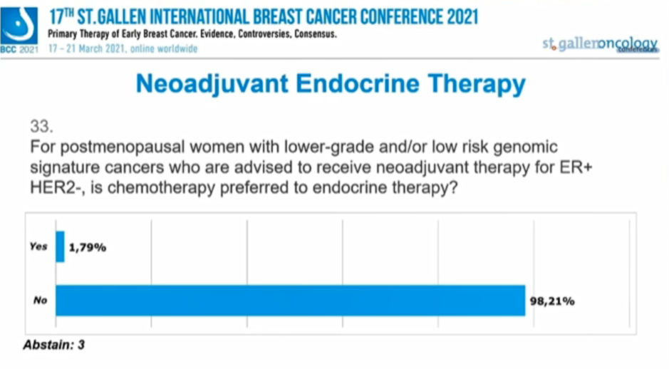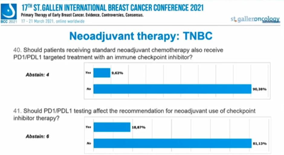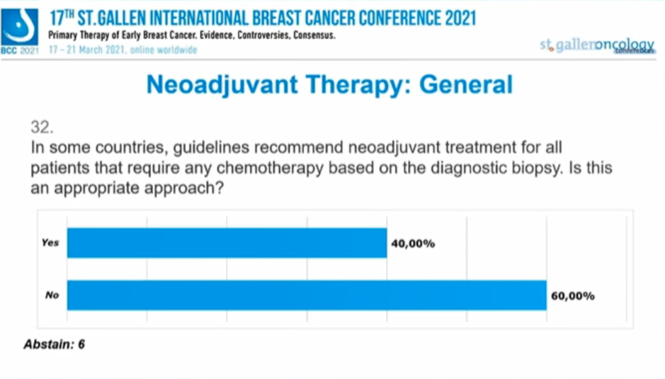 编者按:当地时间3月20日,在Eric Winner教授的主持下,第十七届圣加伦国际乳腺癌大会(SG-BCC 2021)的专家完场了首场投票,本文总结“新辅助治疗”以及“新辅助治疗后”的专家投票结果。