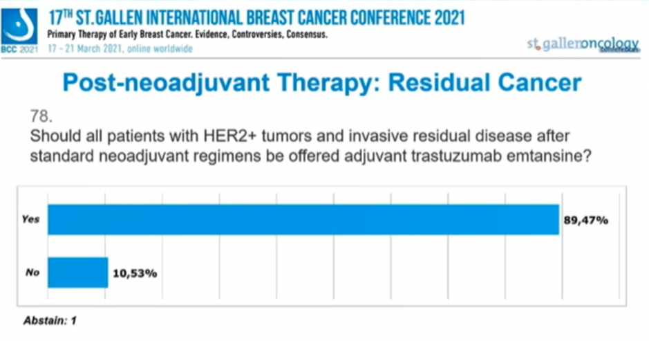 经标准新辅助治疗后仍有浸润性残存疾病的HER2+患者,是否都应该给予T-DM1辅助治疗?