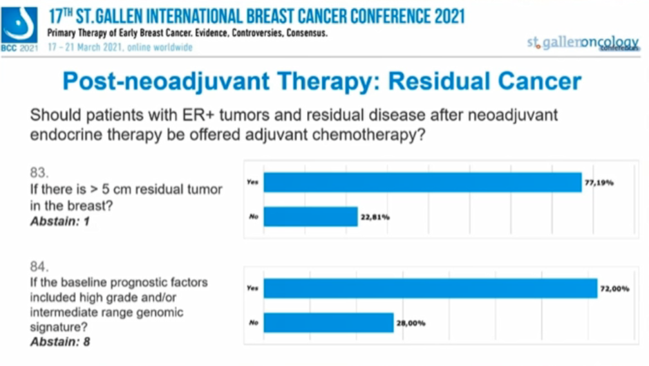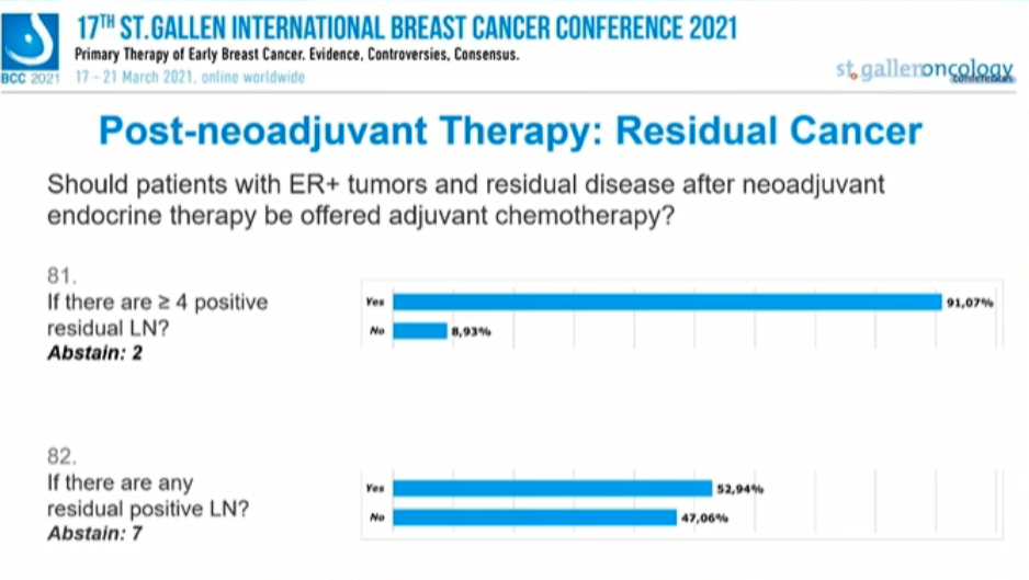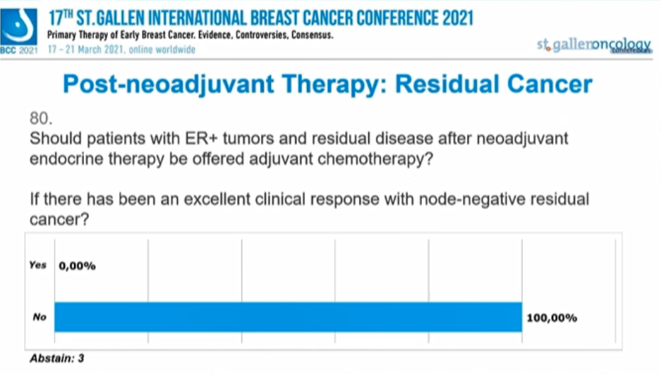 若新辅助治疗反应良好,有残存病灶(但淋巴结阴性),所有投票专家(100%)均认为无需辅助化疗,另有3人弃权。