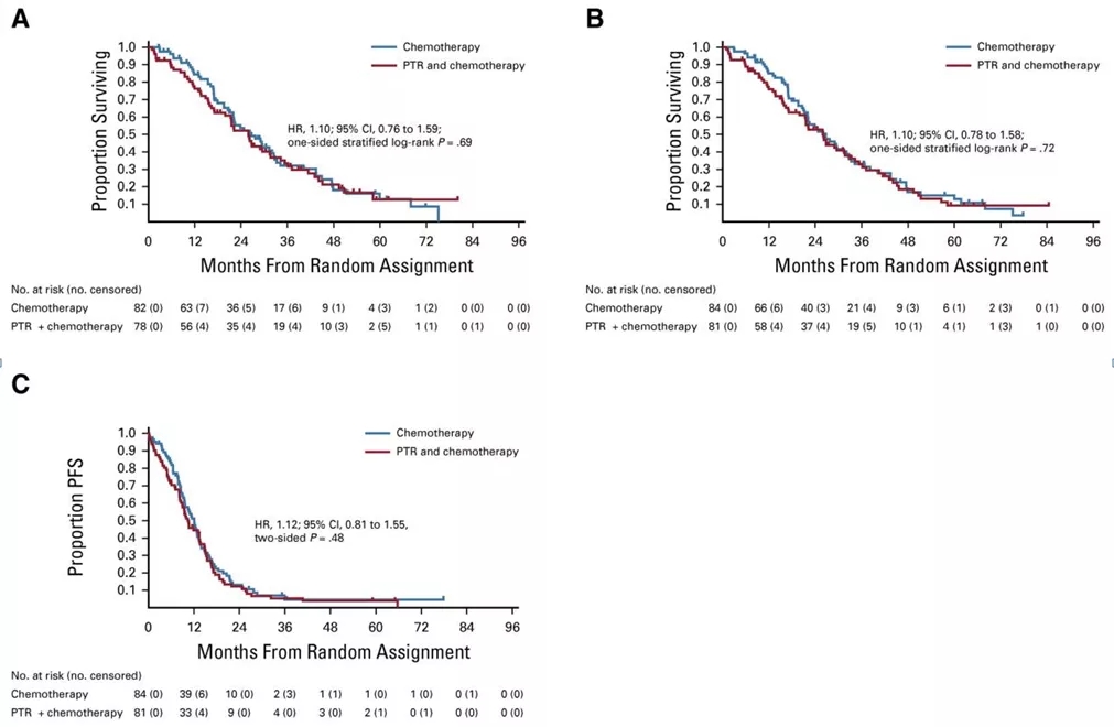 包括了所有患者(165例)的最新分析结果显示,接受单纯化疗的患者的3年OS率为33% (95%CI:22.5~43.9),而接受原发肿瘤切除后再接受化疗的患者3年OS率为32.9% (95%CI:22.2~44),中位OS(26.4个月vs. 25.9个月;HR=1.11;95%CI:0.78~1.58)(图1B)。