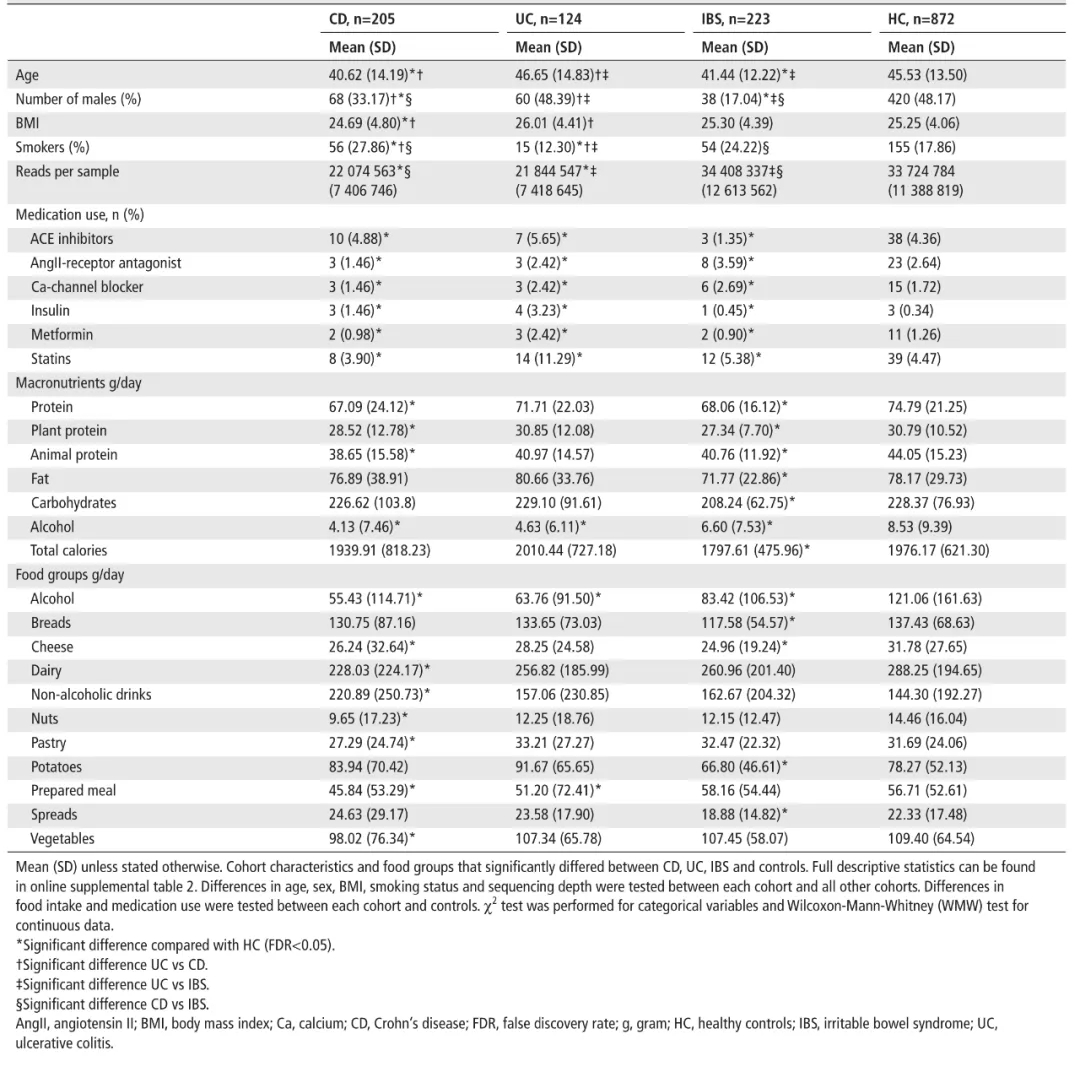 与健康对照组相比,肠易激综合征组平均卡路里的摄入量更低,反映出在肠易激综合征组中女生比例更高(女性与男性比例为2:1);肠易激综合征组女性比例为83%,健康对照组女性比例为52%。