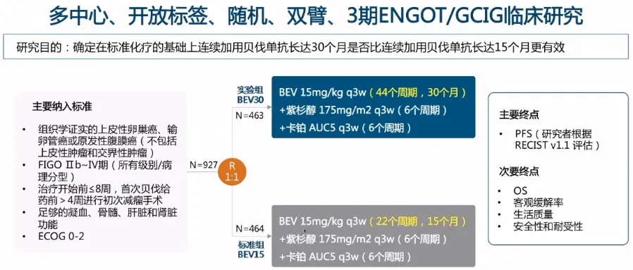 本研究的目的是确定在标准化疗的基础上连续加用贝伐珠单抗长达30个月是否比15个月更有效。研究纳入927例FIGO IIB-IV期原发上皮性卵巢癌、输卵管癌或腹膜癌患者(83%为EOC)。