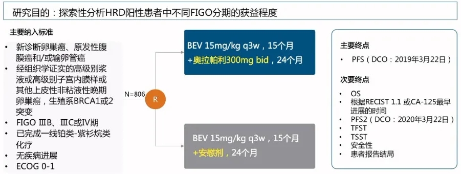 研究目的是探索性分析HRD阳性患者中不同FIGO分期的获益程度。该研究纳入已完成一线铂类-紫杉烷化疗的新诊断FIGO III-IV期卵巢癌患者,接受贝伐珠单抗(15 mg/kg q3w,15个月)联合奥拉帕利(300 mg bid,24个月)或安慰剂进行维持治疗。