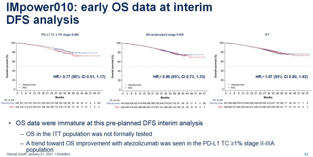 结果显示,在ITT人群分析中,阿替利珠单抗降低复发或死亡风险的幅度具有临界意义,中位随访32.2个月后的风险比为0.81(P=0.04),中位无复发生存(DFS)分别为NE和37.2个月,2年DFS率分别为71.4% vs 63.6%,3年DFS分别为57.9% vs 52.6%。DFS中期分析中,OS数据还不成熟,PD-L1 TC≥1%的 II-IIIA患者中呈现获益趋势。