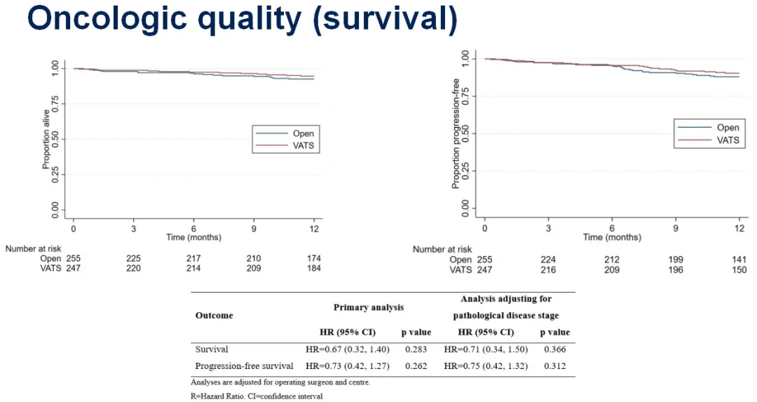 随机对照试验VIOLET对比了视频辅助胸腔镜手术与开腹肺叶切除术在早期肺癌患者中的应用,2021 ASCO年会发布1年随访结果。主要终点为5周时的身体功能(QLQ-C30),次要终点为临床疗效(疼痛、住院时间)、手术安全性(并发症、再入院)、肿瘤学评估(淋巴结转移、辅助化疗时间、疾病复发、生存期)、一年成本效益。