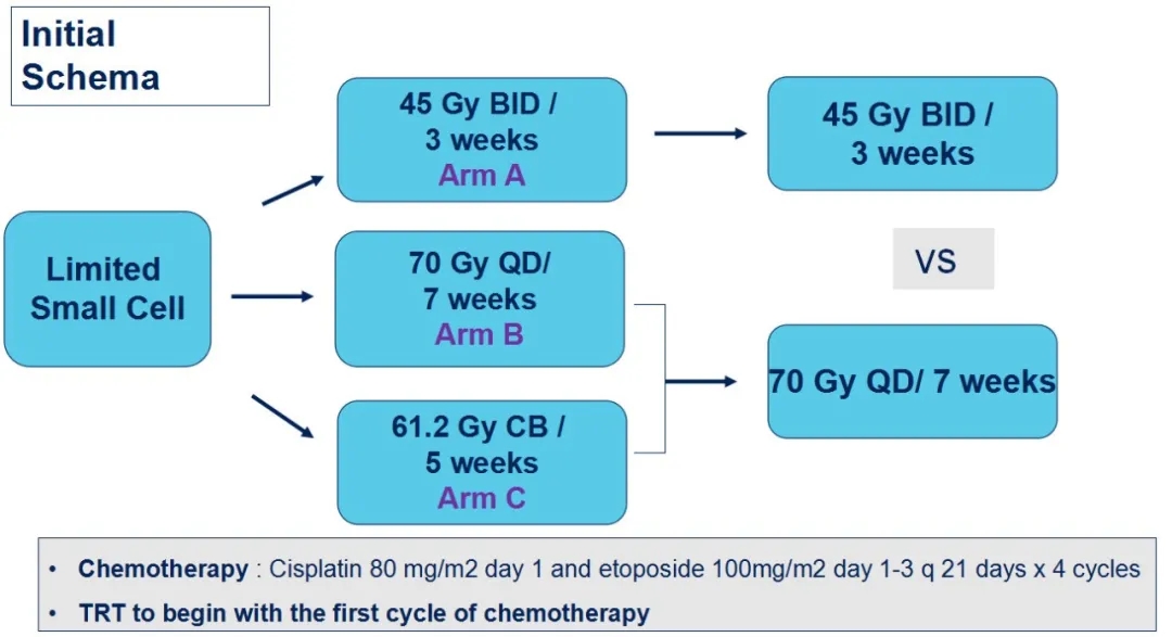对于局限期小细胞肺癌的放疗方案,每日两次胸部放疗优于每日一次的里程碑式研究是1999年发表的Intergroup 0096,这项研究中每日一次组的剂量是45Gy。2015年《柳叶刀·肿瘤学》发布的RTOG 0617研究结果显示,和标准剂量60Gy相比,提高放疗剂量至74Gy,并不能带来更多的生存获益。Ⅲ期CALGB 30610/RTOG 0538试验旨在确定在接受放化疗的局限期小细胞肺癌患者中,与标准45 Gy每日两次(BID)相比,给予高剂量每日一次(QD)胸部放疗是否会改善OS。