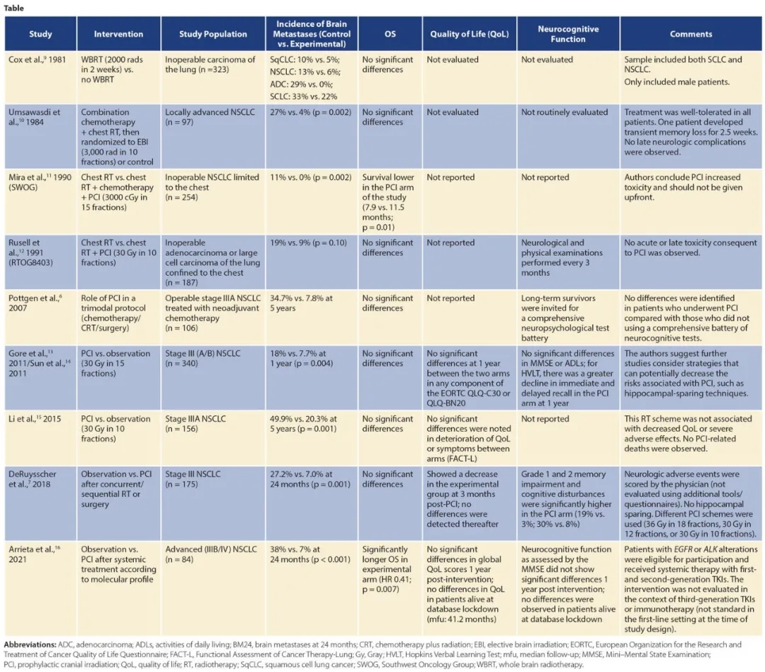 脑转移的预防性放疗(表1)一直不被认为是局限期小细胞肺癌(SCLC)之外的标准方案,特别是随着新型靶向疗法的激增和获批,癌基因驱动型肺腺癌患者的治疗已经改善的情况下。然而,最近发表的一项随机临床试验引发了一些争论。