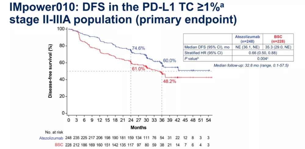 IMpower010是一项全球多中心、开放标签、随机Ⅲ期研究,共入组1280例完全性切除的IB(≥4cm)~IIIA期(UICC第7版)NSCLC患者,给予4个周期含铂化疗后,分别接受16个周期的阿替利珠单抗(1200mg,Q3W)或最佳支持治疗(BSC)。