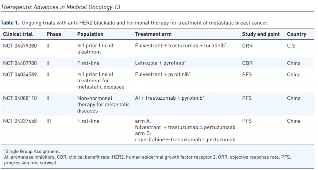 图3. 内分泌联合抗HER2治疗正在进行的临床研究[1]