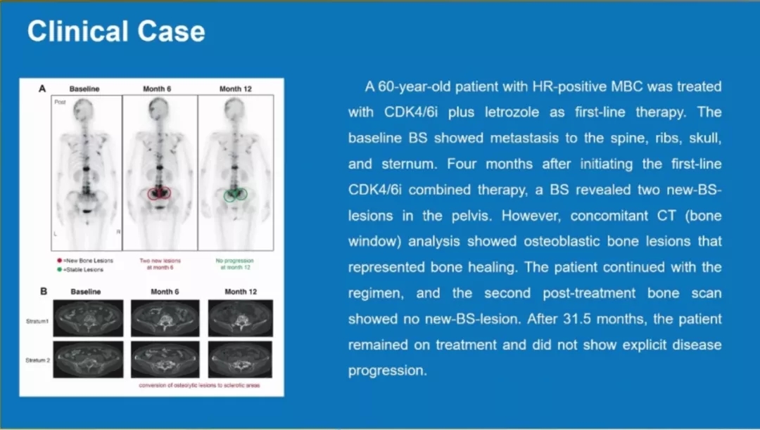 复旦大学附属肿瘤医院张剑教授以转移性乳腺癌影像评估难点——骨假性进展为主题,发表了《Determination and clinical significance of bone pseudoprogression in hormone receptor-positive metastatic breast cancer》[2]。转移性乳腺癌骨假性进展是由于成骨细胞愈合在骨扫描表现为“新病灶”的出现(详见图4),但非真正的骨转移疾病进展,研究团队通过48例的回顾性研究设计分析发现,骨假性进展和真实疾病进展之间的中位数间隔为21.26个月,提示临床医师需提高对骨假性进展的认识,从而避免过早中止治疗,并最大限度地利用内分泌治疗。