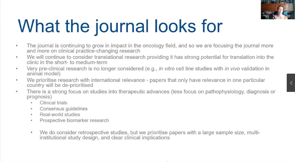 TAM的责任主编Georgia Patey女士从编辑角度,特别强调了TAM的投稿接受内容包括临床指南、临床研究、真实世界研究以及新兴生物标记物研究,如果投稿类型为回顾性研究,建议设计为大样本量、多中心并且临床应用清晰明了(详见图7)。在总结8篇录用的中国乳腺癌特刊稿件时,Georgia Patey女士提到,录用文章的亮点包括多中心、大样本量、前瞻性设计、解答临床热点问题、发现新型生物学标记物等。