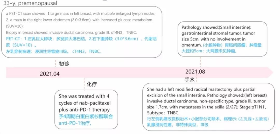 问题:这位33岁的患者确诊左乳局部晚期乳腺癌(TNBC),PET-CT发现腹部结节。行化疗+免疫治疗后,乳腺肿物部分缓解,行左乳改良根治术+小肠肿物切除术,术后病理提示左乳腺癌(pT1N1),小肠结节的术后病理为胃肠间质瘤。下一步的治疗策略是?