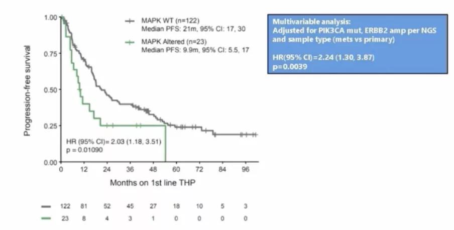该研究通过测序确定了733例存在ERBB2扩增的原发瘤(n=385)和转移瘤(n=348)。在30%的肿瘤患者中发现同时存在PIK3CA突变。12.8%的肿瘤中观察到发生涉及MAPK通路的致病性突变,最常见的突变是NF1缺失、ERBB2和RAS激活突变。转移性肿瘤的MAPK突变率(16.6%)显著高于未转移的原发瘤(9.8%,P=0.020)。研究人员对145例HER2+晚期乳腺癌患者在一线THP治疗前进行测序,结果显示20%(29/145)的肿瘤未发现基因组ERBB2扩增,其预后明显较差(mPFS分别为9.4 vs 22.8个月;P=0.015)。此外,PIK3CA突变还与较短的PFS相关(13.0 vs 23.4个月,P=0.0013)。