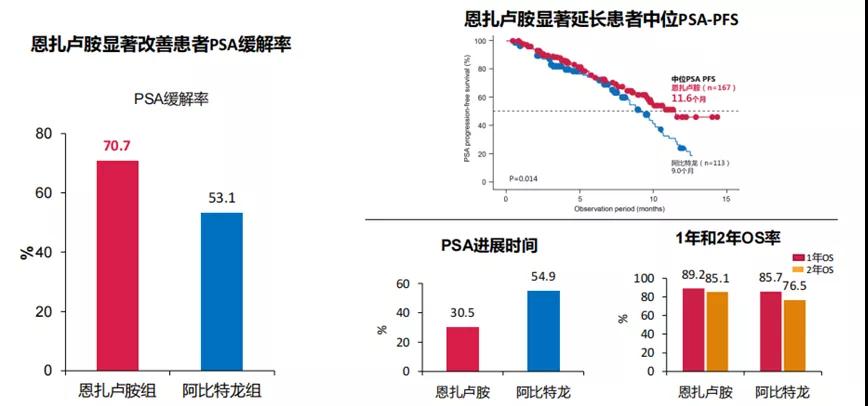 目前还没有头对头比较的研究,但已有一些基于临床研究数据的间接比较。2021年ASCO-GU报道的一项网络荟萃分析,比较了PROSPER、SPARTAN、ARAMIS和STRIVE等关键研究的数据显示,恩扎卢胺相较于比卡鲁胺、达罗他胺有显著的MFS和TTPP延长,但三种新型AR抑制剂的OS没有显著差异。