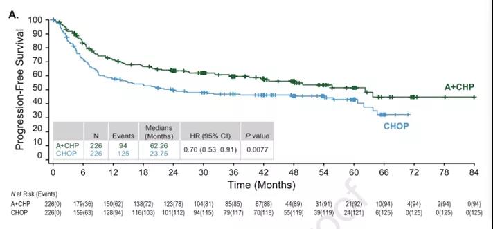 在ECHOLON-2研究长达5年的随访中,维布妥昔单抗联合CHP(A+CHP)能进一步改善外周T细胞淋巴瘤的生存,结果显示,A+CHP组患者的PFS为62.3个月,显著优于CHOP组的23.8个月(HR=0.70,p=0.0077);另外A+CHP组患者的5年PFS率为51.4%,同样优于CHOP组的43%(详见下图)。目前针对B细胞淋巴瘤的ADC药物也显示出了较好的疗效和可控的安全性。